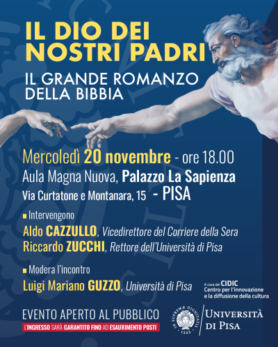 Mercoledì 20 novembre, ore 18, Aula Magna Nuova La Sapienza, "Il Dio dei nostri padri - Il grande romanzo della Bibbia": intervengono Aldo Cazzullo e il rettore dell'Università di Pisa Riccardo Zucchi. Ingresso libero fino ad esaurimento posti