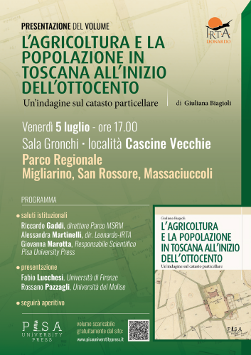 Venerdì 5 luglio, al Parco Regionale Migliarino, San Rossore, Massaciuccoli, presentazione del volume "L'agricoltura e la popolazione in Toscana all'inizio dell'Ottocento" di Giuliana Biagioli, edito da Pisa University Press.