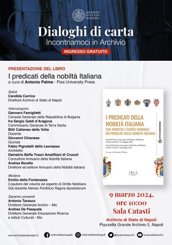 Sabato 9 marzo alle ore 10, nella sede dell'Archivio di Stato di Napoli, presentazione del volume: "I predicati della nobiltà italiana con annesso l'elenco generale dei predicati della nobiltà italiana" a cura del professor Antonio Palma, edito da Pisa Un